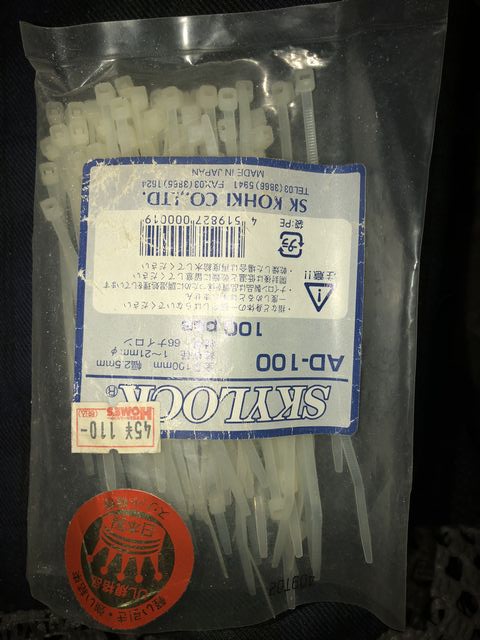 天板固定にビニタイ4本 穴を開けるだけで固定が簡単です。100mm程度の短い物でOKです。