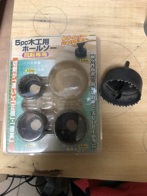 40ソケットの外径は54mmで、コーナンで売っていた5pcホールソーセット(与板利器工業製)の中の54mmがジャストサイズだった。(5pcと言ってもドリル軸を含むのでホールソーは4種類)