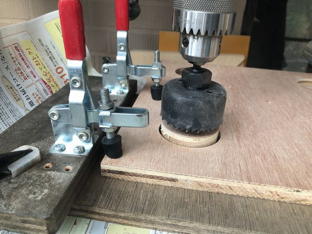 トグルクランプで材料を固定出来るので、楽に安全に穴を開ける事が出来る。