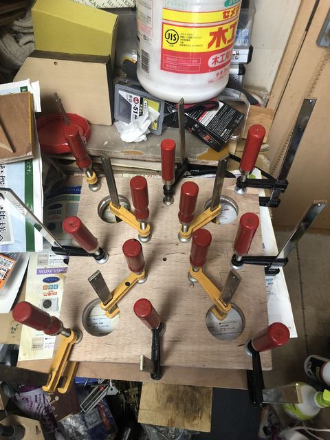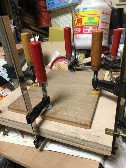 バッフル対面の裏板に関してはダクトの穴が空いてないので、ズレないように一旦ハタガネで数箇所固定してから手持ちのF字クランプを使って圧着する。真ん中付近は余り力が掛からないので、適当な板を挟んでテンションが掛かるようにした。