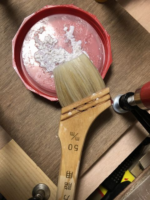 接着は木工ボンドだが面積が広いのでボンドが乾き始めるので、水で薄めて大きめの50mmの刷毛で両面に素早く塗って貼り付ける必要が有る。