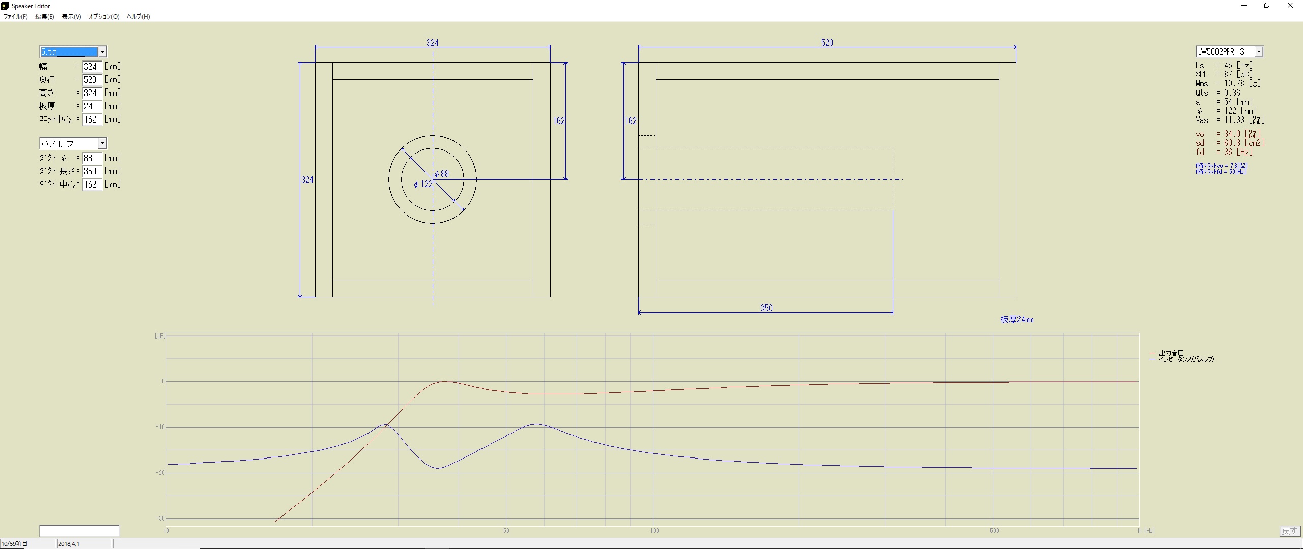 SPEDはマルチポートには対応していないのでVU40の内面積の4倍の面積のシングルバスレフとしてシミュレートした。ダクト長350mmでfdが約36Hzになる。
