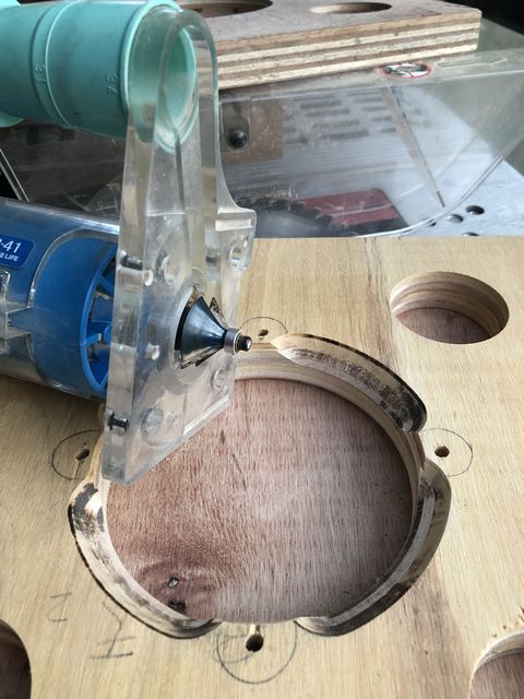 爪付きナットの部分以外の円周を45度の傾斜が付いた角面ビットを使ったトリマーで斜めに削る事により振動板が抵抗無くスムーズに動き、角の部分での風切り音などの異常音の発生を防ぐ事が出来る。