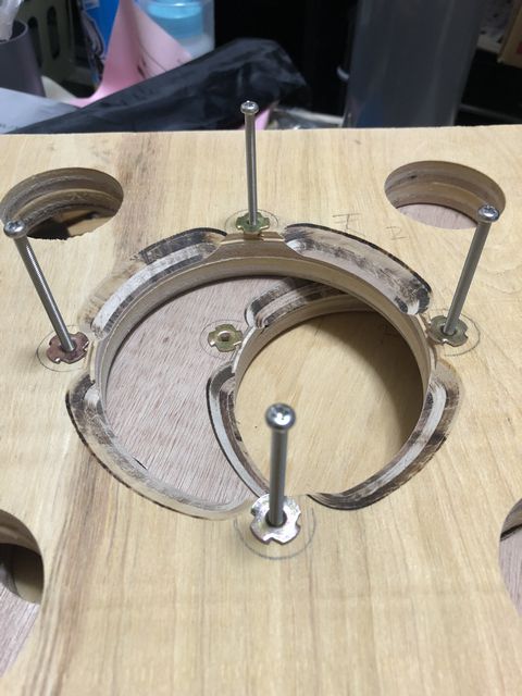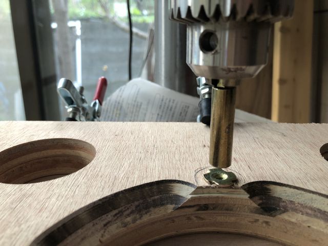 それからは万力を使って打ち込むようにしていたが、今回はボール盤に治具を付けてこれで押し込む事で爪付きナットを嵌め込んだ。万力に比べてかなり効率的に嵌め込む事が出来る。