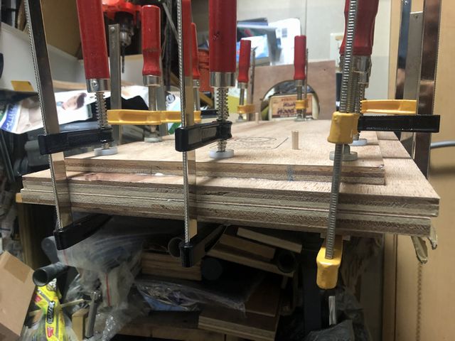 板はせっせと重ねて接着するのだが、クランプをかなりの量を使うので数量の関係もあり、順番に接着するので時間が掛かる。