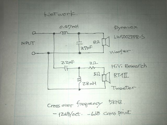 ツィーターに直列に3Ωの抵抗を繋げるだけで、丁度、電圧で1/1.6のアッテネーター(電力比4dB)になり、見掛けのインピーダンスが8Ωとなり簡単な回路で済む。これでウーファー、ツィーター共に8Ωのインピーダンスと見なしてネットワークを組める用になった。