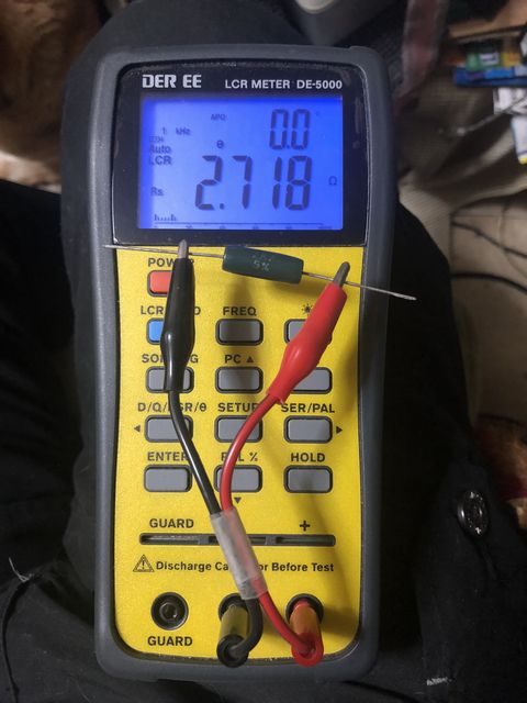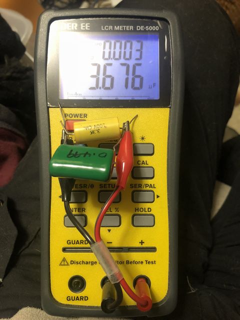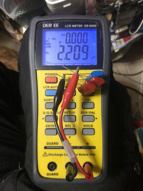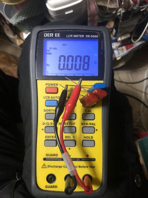 今回はツィーターに使うコンデンサはDER EEのLCRメーターDE-5000で10kHzでのESRを測定して、その値が小さかったメタライズドポリエステルフィルムコンデンサを使用した。