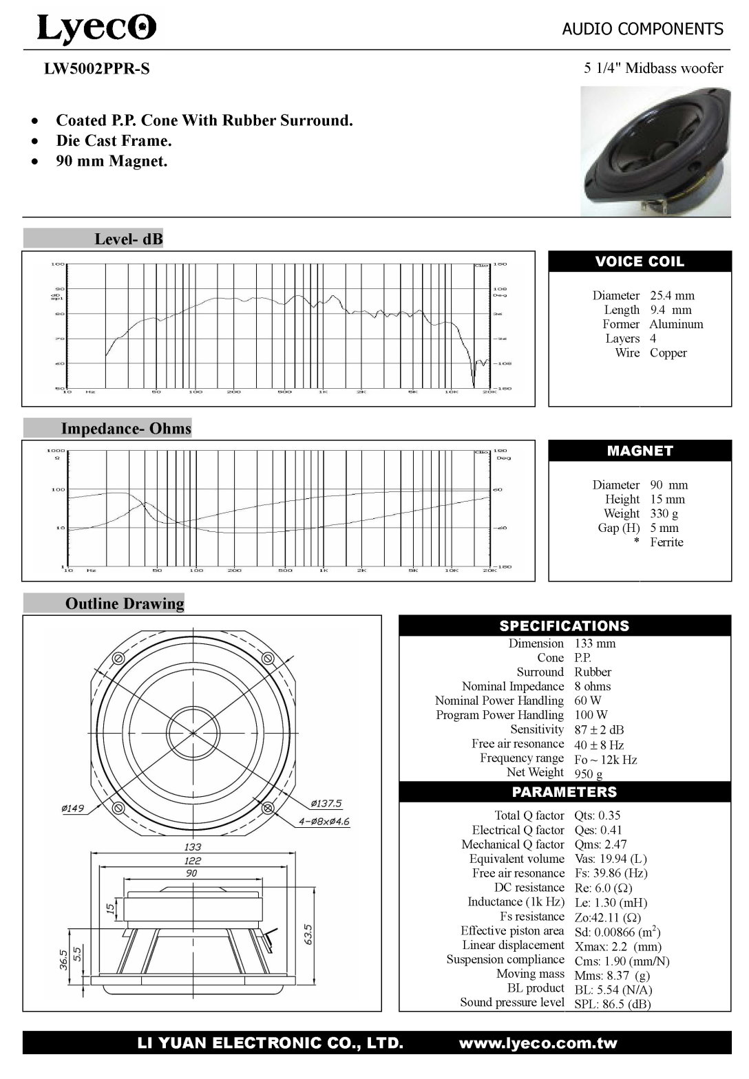 ウーファーLW5002PPR-Sの能率(出力音圧レベル:英文ではSensitivity)は87dB/m/w(2.83V )になっている。
