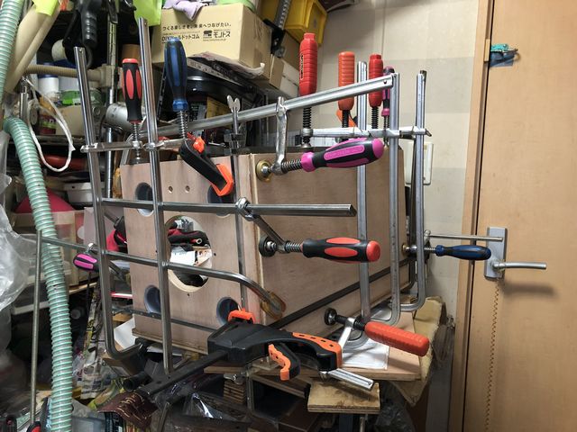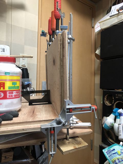 L字クランプ、F字クランプ、ハタガネを使って組み立て開始。