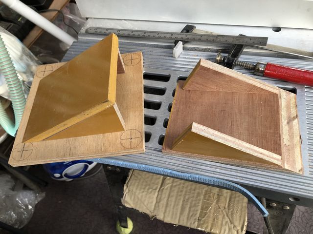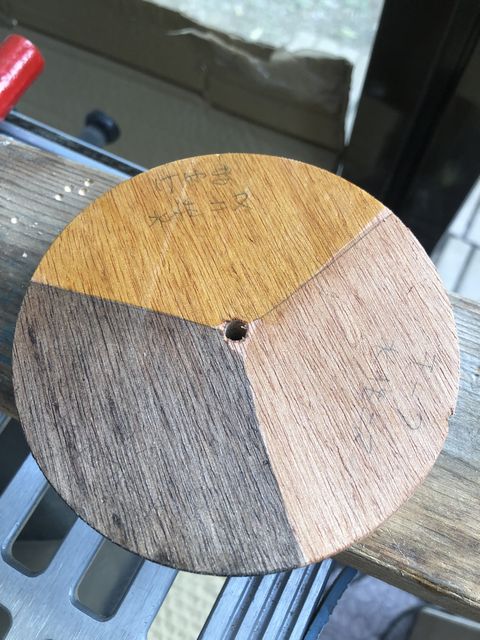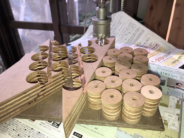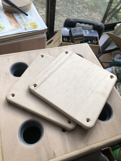 脚は以前にも使った建材の積層材で厚みが37mmで2個連結すると74mmとなり、ツィータープレートの高さに丁度良い。そこで、35mmのホールソーで28mm径にくり抜いて作った。