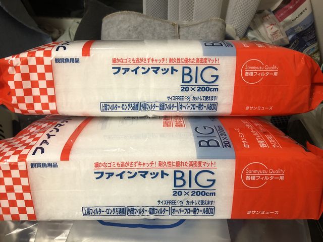 JSP箱の吸音材は、以前作った時は裏板と側板に沿ってパイプの外側に全体的に充填した記憶があるので、今回は熱帯魚用のフィルターの20cm幅で200cmの長さのファインマットBIGというのを買って来ました。