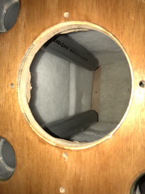 シミュレーションでは350mmの長さでfd=36Hzになるので、それを基準にカットするが、バッフルには40のソケットを組み込んであるので、その分(約30mm)を差し引く必要が有る。
