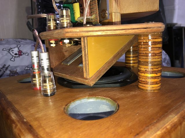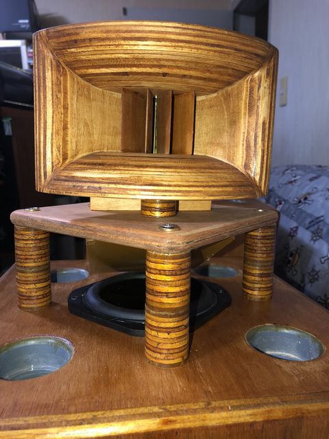 ユニットを取付けた後は、積層板で作った脚をスペーサーにして組み上がったツィータープレートをステンのコーススレッドで固定します。