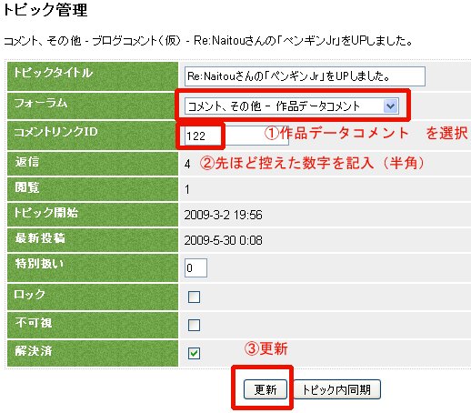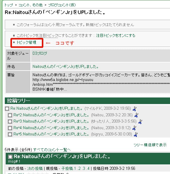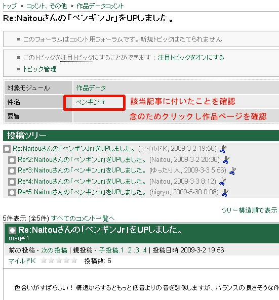 - 登録済み作品へのコメントと思われるトピックがあったら、トピックタイトルをクリックして表示します。 トピック内の全投稿が表示される状態とします。