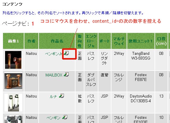 - 下画像の、編集マークリンクにマウスを合わせて、リンク先URLの中の「content_id=xxxx」の「xxxx」部分の数値を頭にメモっておきます。